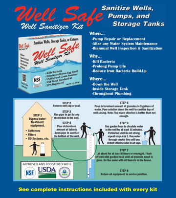 The Well Safe® - Well Sanitizer Kit is designed for easy, DIY water purification and well treatment. It kills bacteria, improves taste and odor, and reduces iron bacteria build-up.